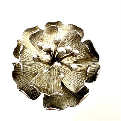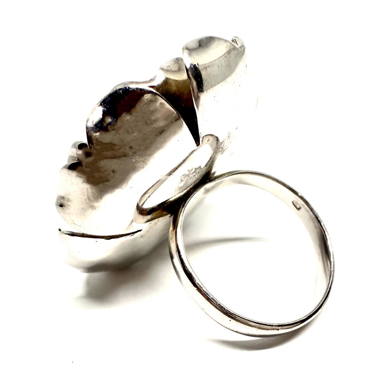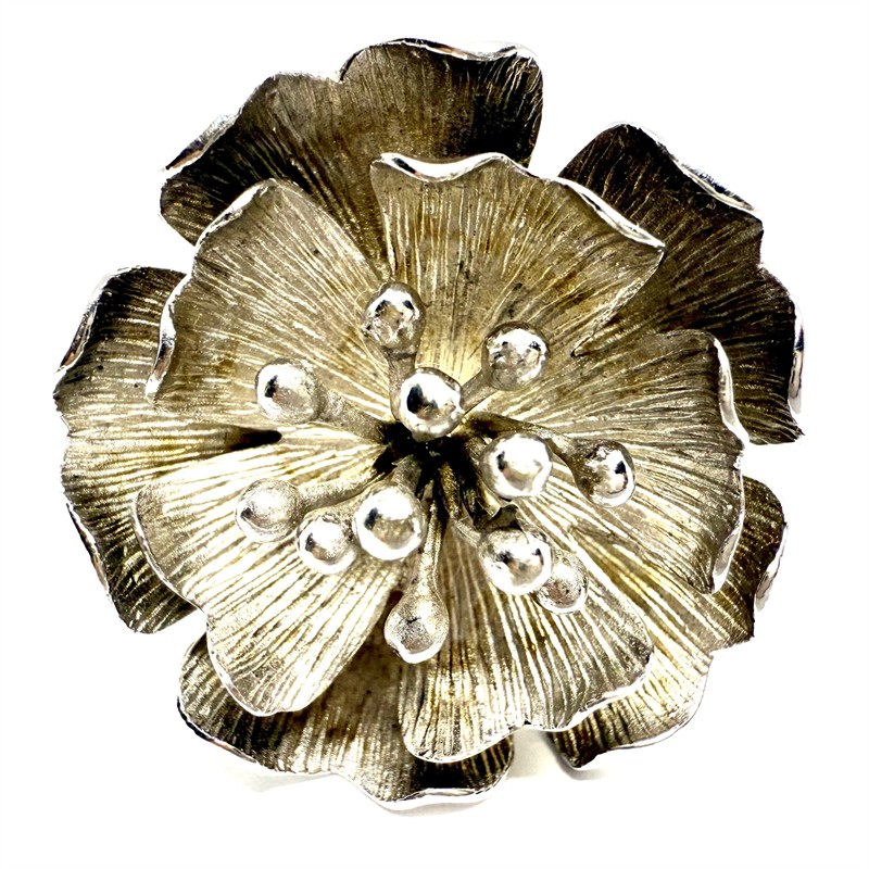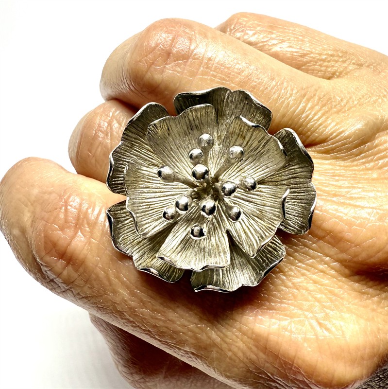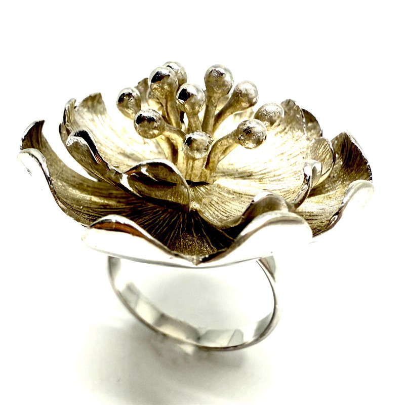 Nepřehlédnutelný, celostříbrný, originální prsten -květ. Šperk byl vyroben ze sterlingového stříbra (925/1000), o celkové váze 14,46 g. Bohatý květ je detailně zdoben. Velikost 56. Perfektní stav.