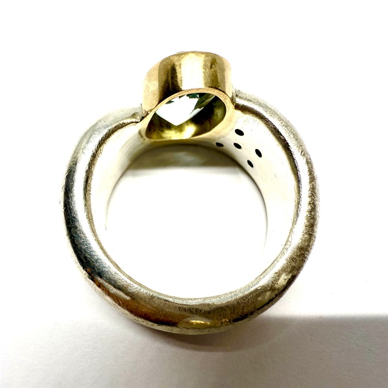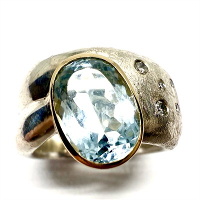 Originální, grandiózní prsten zhotovený v kombinaci sterlingového stříbra (925/1000) a 18ti karátového zlata (750/1000). Šperku vévodí velký akvamarín zasazený do masivní zlaté obroučky. Dle Puncovního úřadu více než 2,49 g. Akvamarín jemně dozdoben seskupením 5ti briliantů. Drahé kameny jsou přírodního původu. Šperk vyniká mimořádnou kvalitou materiálů i zpracování. Celková váha 33,49 g. Velikost 64 . Jedná se o ateliérový, originální šperk v perfektním stavu.
