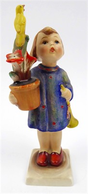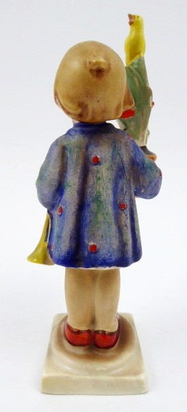 Ručně malovaná keramika. Světoznámá firma W. Göbel Porzellan, kolekce Hummel, Oeslau. Návrh: Reinhold Unger (1880-1974). Datace: rok 1935. Název figury: Ich gratuliere (Gratuluji). Tato figurka z kolekce Hummel je publikována v knize - Dieter Struss: M.I. Hummel Figuren. Vydané nakladatelstvím Battenberg v Augsburgu v roce 1993. Strana 86 obrázek HUM 17, vlevo dole popis. Dívenka v modrých šatech s červenými puntíky s trumpetkou převázanou mašlí v levé ruce a v pravé gratulující s velkou květinou v květináči, na níž sedí žlutý zpívající ptáček. Ručně malovaný obličej i další části. Na nízkém čtverhranném podstavci. Značeno zespodu: značka firmy, vtlačená čísla a značka malíře. Německo, Oeslau 1935 - 1950. Výška 15,5 cm.