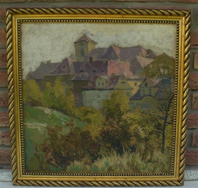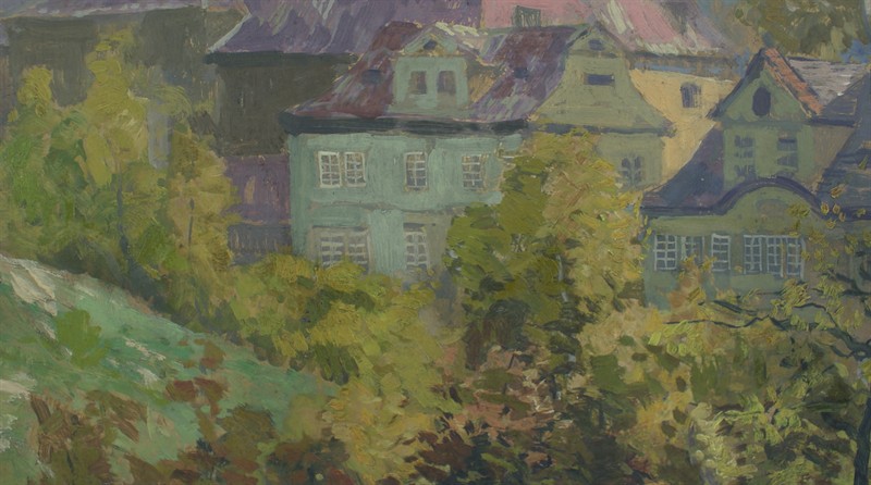 Pohľad na okraj mesta, tipický Slavíčkovský impresionizmus. Olej na kartónovej lepenke, 49,5 x 49,5 cm, 57 x 57 cm spolu s rámom, sig. a dat. (19)10 vpravo dole, v dobrom stave.