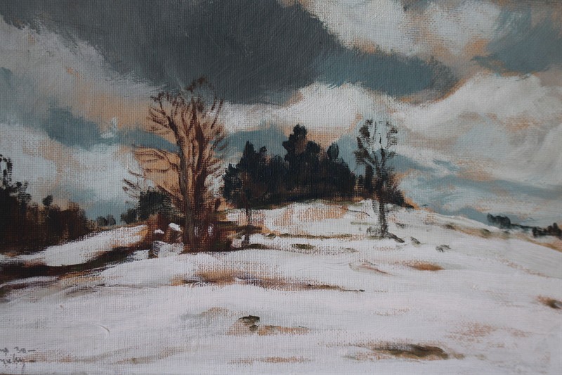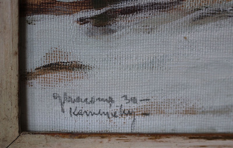 Gustav Macoun (1889 - 1934) - Kameničky 1930   Signováno viz foto. Již v chlapeckém věku se projevilo jeho nadání, krátce se učil u Václava Jansy a s jeho doporučením u Al. Kalvody a u Ant. Slavíčka na pražské AVU. Impresionista, maloval zejména podzimní a zimní melancholické krajiny. Inspirací mu byla krajina Českomoravské vrchoviny a Českého ráje. Často také zobrazoval mizející zákoutí Prahy.  Olej na kartonu. Rozměry: 25 x 35 cm malba, 42 x 51 cm rám.