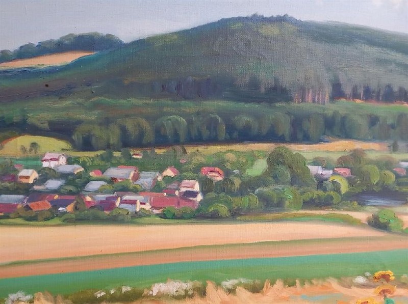Obraz Havlovice, pohled na Zámeček a Vavřineček je olejomalba na plátně podepsaná vpravo dole K. Kuneš a datovaná rokem 1973. Obec Havlovice je malebná vesnice v Plzeňském kraji, ležící 3 km západně od Domažlic. První zmínka pochází z roku 1789. Jižně od vesnice se v poloze Na Zámku nachází poškozené pozůstatky raně středověkého hradiště z desátého století. Hovorově se pozůstatkům na kopci říká Zámeček. Za Zámečkem je další kopec, Veselá hora, na jejímž vrcholku stojí kostel zasvěcený svatému Vavřinci. Tomuto poutnímu místu se lidové říká Vavřineček. Autor obrazu je Karel Kuneš, malíř žijící v letech 1908-1992 na Domažlicku.