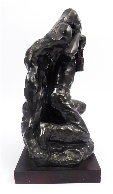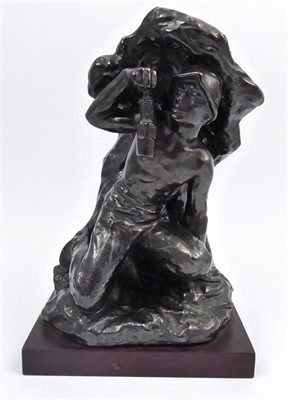 Glazovaná keramika s listrem s výrazným metalickým efektem, dřevo. Pravděpodobný autor: Vojtěch Zeilman (nar. 1896) spolupracující s RAKO, Rakovník. Výrobce: RAKO, Rakovník. Keramická figura horníka držícího v pravé ruce kahan a pohybujícího se v nízkém a úzkém prostoru uhelné sloje. Listr, jenž zajišťuje výrazný metalický efekt, umocňuje dojem z ponuré tmy v podzemí dolu. Na obdélném nízkém podstavci z hnědého lakovaného dřeva. Československo, Rakovník 1925 - 1955. Výška 31 cm, rozměr podstavce 19,5 cm x 15 cm.