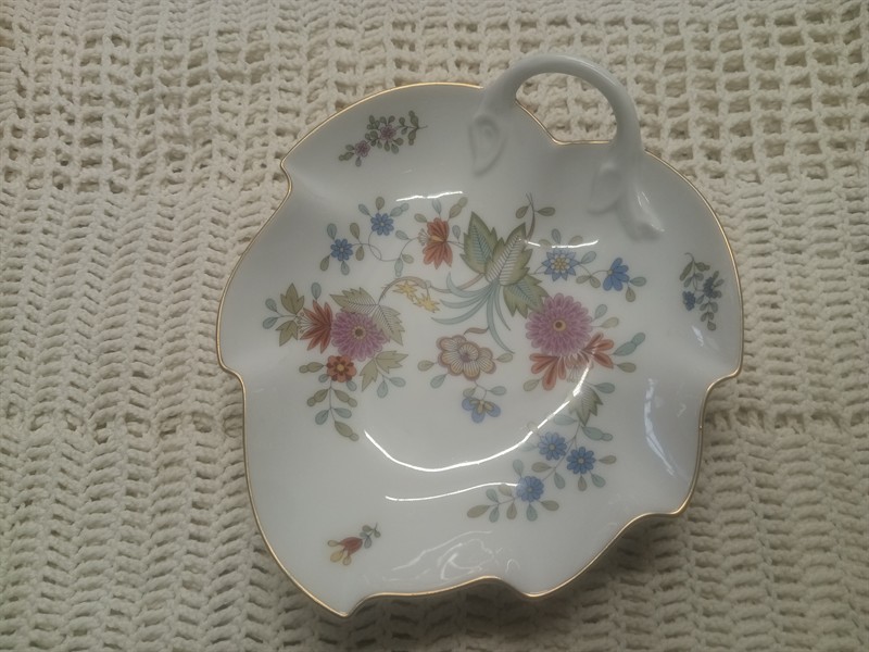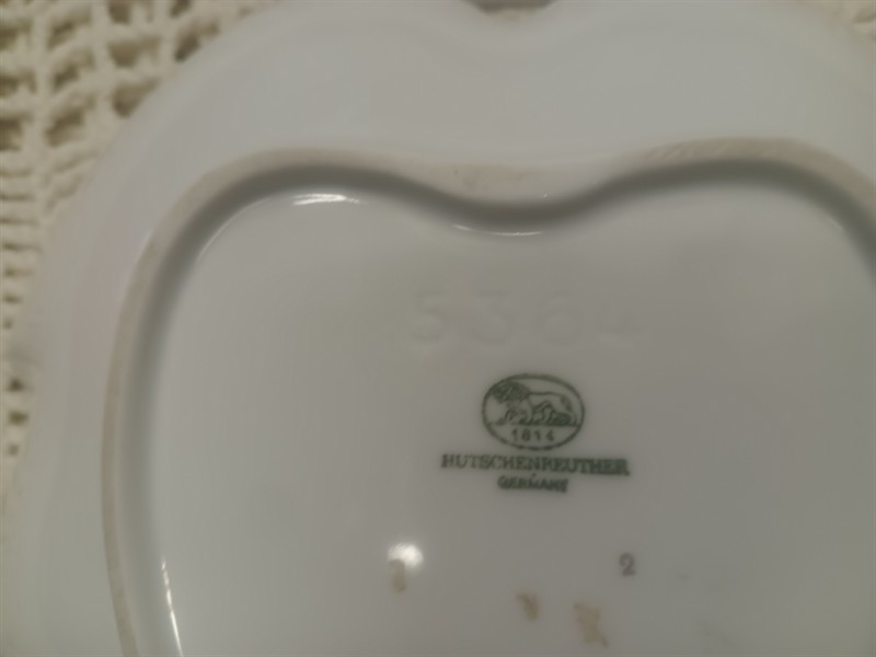 Krásný servírovací podnos ve tvaru listu , porcelán, značeno Hutschenreuther . Rozměry 21,5 x 19 cm .