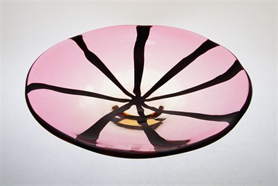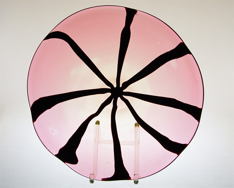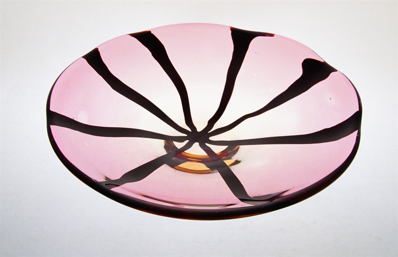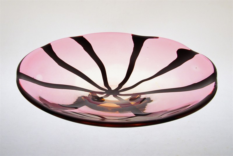 Mísa z autorského hutního skla v odstínu Rubín ve které je zatavený organický ornamentem z tmavého skla. Návrh z roku 1960 je od malíře, grafika a sklářského výtvarníka - Vladimír JELÍNEK (*1934 +2023). Provedla sklárna Ústředí uměleckých řemesel ve Škrdlovicích. Dobrý stav, rozměr - prům. 29cm, v. 7cm