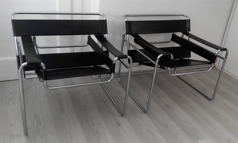 Křeslo Wassily chair model B3 navrhl slavný designér Marcel Breuer, ve 20. létech minulého století, ve funkcionalistickém stylu. Rozměry výška 76 cm, šířka 80 cm, hloubka 75 cm. Materiál chromovaná ocel a černá kůže, obě křesla jsou v perfektním stavu. Kůže a švy jsou bez sebemenšího poškození. Sloužila spíše na reprezentaci a byla naprosto minimálně používaná v nekuřáckém prostředí. Jedná se o značkové licencované kusy z 80. let minulého století vyrobené v Italii špičkovou nábytkářskou firmou Fasem. Dnes se tato křesla ve výborném stavu, podobně jako křesla od firmy Knoll prodávají za cca 2000 Euro za kus. Nejde tedy o levné čínské, nebo jiné repliky, ale o kusy nábytku s trvale rostoucí cenou. Cena je za oba kusy.