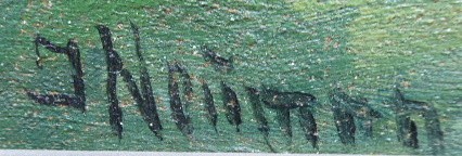 Olej na plátně 35 cm x 45 cm. Signováno vlevo dole. Pohled na dlouhou odvíjející se cestu mezi břízami. V popředí malá vodní plocha, v níž se odrážejí bílá oblaka. Ve velmi pěkném rámu se zlacenými ornamenty listů a vnitřní zlacenou lištou. Střední Evropa 1900 - 1920. Celkový rozměr s rámem 42 cm x 52 cm.