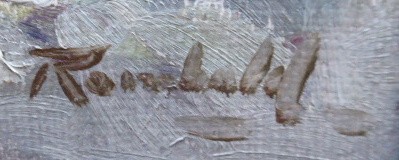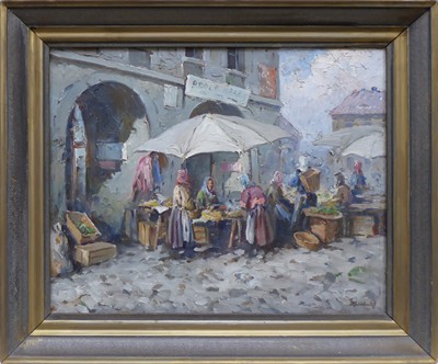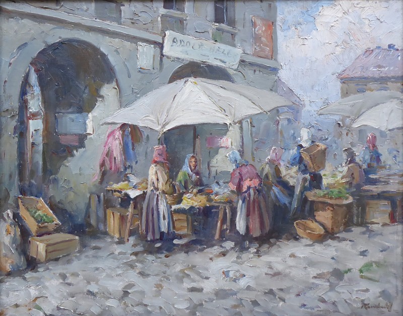 Olej na plátně 38 cm x 48 cm. Signováno vpravo dole. Olejomalba zachycující půvabně čilý ruch na městském trhu v podloubí. V profilovaném zlatavém rámu s patinou. Československo 1920 - 1935. Celkový rozměr s rámem 48 cm x 58 cm.