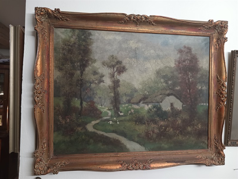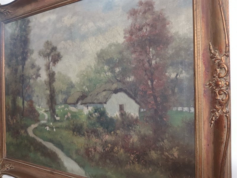 J.Szabo , olej na plátně, krajina s chalupou. Obraz je v původním nerestaurovaném stavu . Krásný vyřezávaný rám . Vnitřní rozměry 80 x 60 cm.