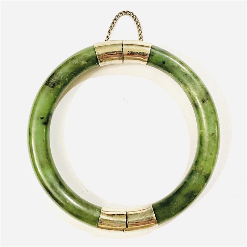 Starožitný, střídmě pojatý kruhový otevírací náramek zhotoven z přírodního sytě zeleného jadeitu, zapínání zdobeno minimalistickým rytím. Dobře kombinovatelný, na tuzemském trhu zřídka se vyskytující typ šperku, kvalitní čínská práce z 2. poloviny 20. století. Zapínání zhotoveno ze stříbřitého obecného kovu; neznačeno. Hmotnost 42,26 g, vnější průměr 80 mm, vnitřní průměr 62 mm, šířka 9 mm. Jazýčkové zapínání v pořádku, připojen pojistný řetízek. Ve velmi zachovalém stavu.