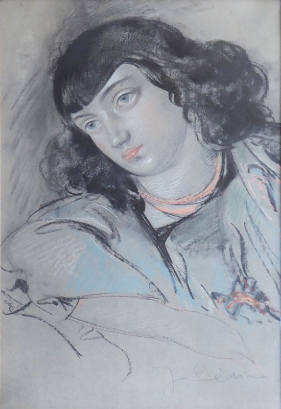 Pastel na papíru 48 cm x 32 cm. Signováno vpravo dole. Autor: Jan Dědina (1870-1955). Portrét mladíka s dlouhými vlnitými vlasy. V originálním zlatém rámu s reliéfními secesními ornamenty a se sklem. Čechy 1895 - 1915. Celkový rozměr s rámem 53 cm x 37 cm.
