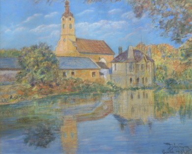 Pastel na papíru 40 cm x 50 cm. Signováno vpravo dole s datací 1913 nebo 1917. Autor: Jan Jáchym (1874-1956). Pohled na římskokatolický Kostel Nejsvětější Trojice v maďarském Gyulu odrážející se na vodní hladině. Tento kostel je jednou z nejvýznamnějších barokních památek v Maďarsku. Jeho stavba byla financována slavným rodem Esterházyů. Stříbrný patinovaný rám se strukturovaným povrchem a sklem. Maďarsko, Gyula, rok 1913 nebo rok 1917. Celkový rozměr s rámem 47 cm x 57 cm.