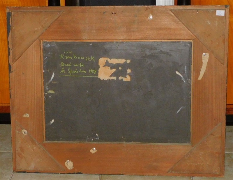 Jan Rambousek (1895 -1976) - Cesta ke Spořilovu. Olej na překližce, signováno vpravo dole Jan Rambousek 1958, 35 x 45 cm, původní rám. Na zadní straně popsáno autorsky - viz foto. Autor byl učitelem na Akademii, asistentem Maxe Švabinského, autorem mnoha knih a článků, jeho specializací byla grafika se sociální tématikou. Olejomalby jsou spíše vzácné.