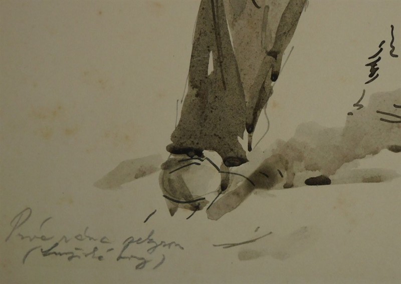 Jan Rambousek (1895 -1976) – Dřevorubec. Akvarel (kresba lavírovaná sépií), papír, signováno vpravo nahoře Jan Rambousek a vpravo dole R-56.. Rozměr 31 x 45 cm, volný list, nerámováno. Autor byl učitelem na Akademii, asistentem Maxe Švabinského, autorem mnoha knih a článků, jeho specializací byla grafika se sociální tématikou.