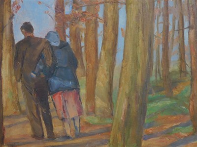 Jan Rambousek (1895 – 1976) – Dvojice v lese. Olej na kartonu, rozměr 30 x 43 cm, nesignováno, rám. Autor byl učitelem na Akademii, asistentem Maxe Švabinského, autorem mnoha knih a článků, jeho specializací byla grafika se sociální tématikou. Olejomalby jsou spíše vzácné.