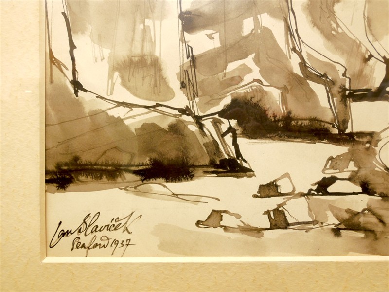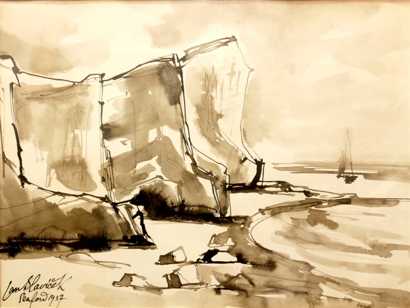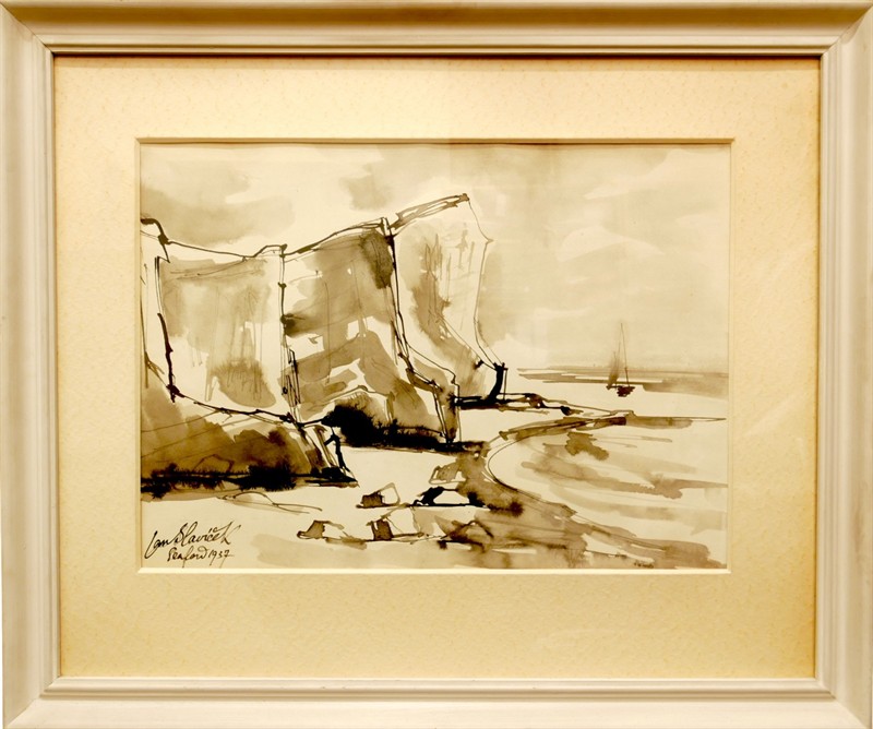 Doverské útesy od Jana Slavíčka, signováno vlevo dole, datováno 1937. Lavírovaná tuš na papíře s paspartou. Zaskleno a zarámováno. Rozměry (výřez pasparty) 36 x 49 cm. Rozměry s rámem 60 x 71 cm.