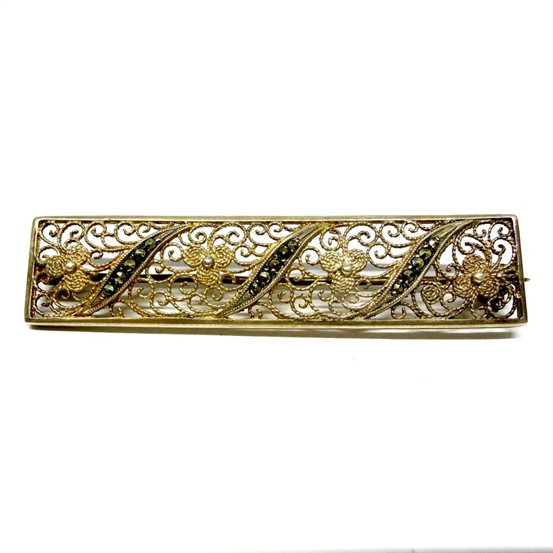 Velmi půvabná, jemná brož z decentně zlaceného stříbra. Šperk nese půvabný florální motiv provedený pracnou technikou filigránu, zdobeno decentními markazity. Stříbro ryzosti 800/1000. Jehla z funkčních důvodů obecný kov. Celková váha 4,41 g. Rozměry cca 5 x 1 cm. Šperk vynikne především na tmavém, jednolitém povrchu. Výborný stav.
