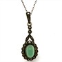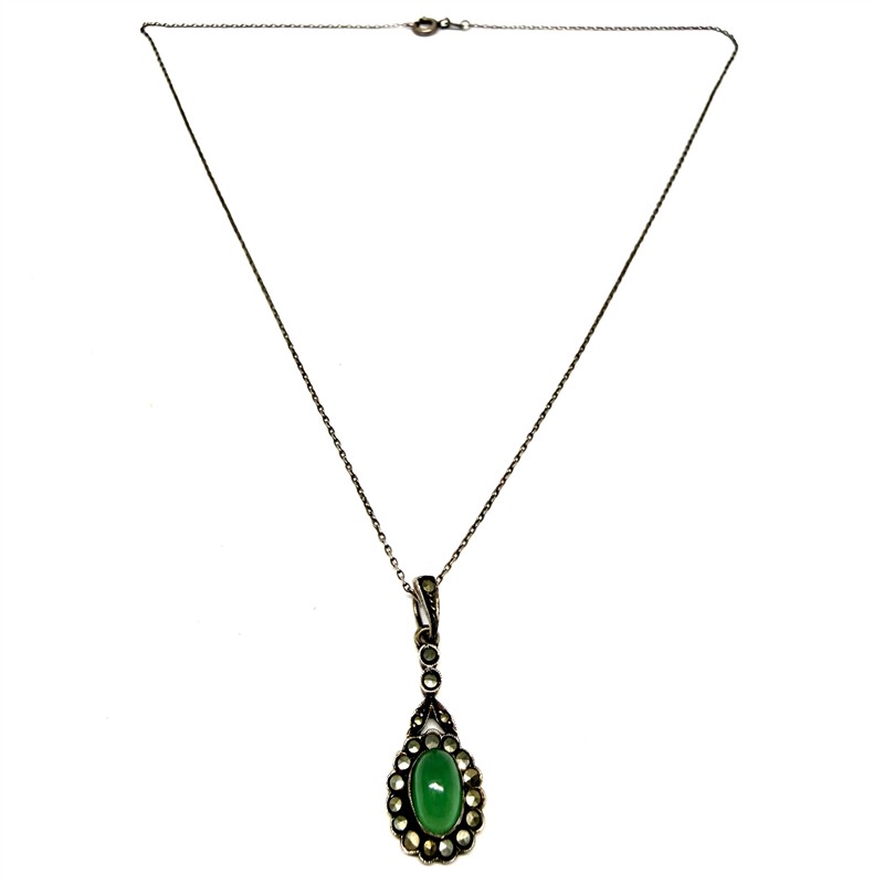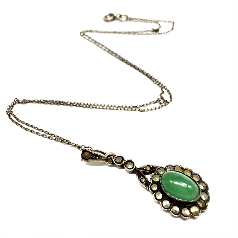 Velmi půvabný, něžný náhrdelník z první poloviny 20. století. Šperk byl zhotoven ze stříbra ryzosti 935/1000 a tvoří jej řetízek a odnímatelný závěs. Tem zdobí hladce, do oválu broušený chryzopras orámovaný elegantními markazity. Celek působí jako květ. Celková váha 2,34 g. Délka řetízku 42,5 cm, délka závěsu 3 cm. Výborný stav.