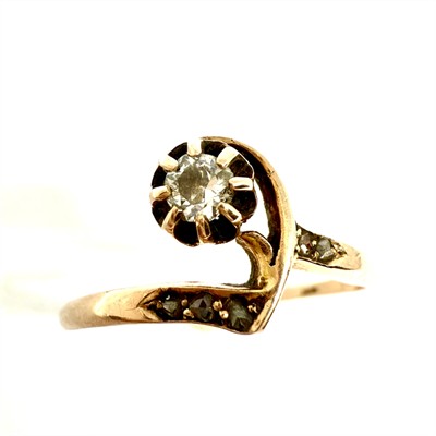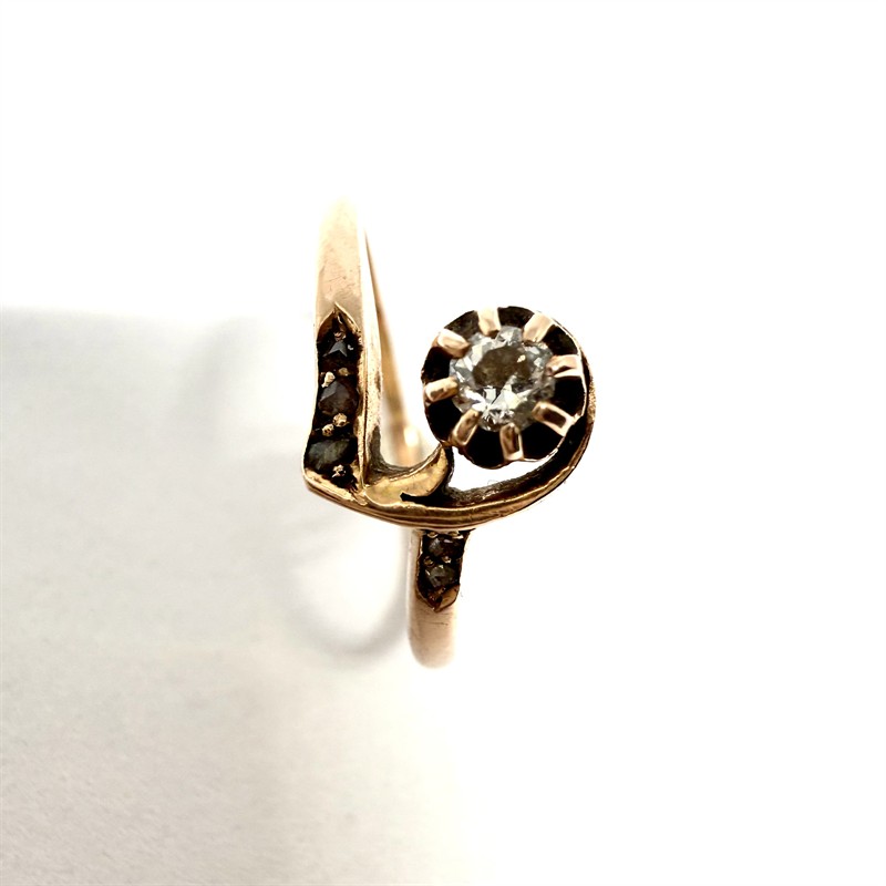 Půvabný, velmi jemný prsten zhotovený v první polovině 20.století v secesním stylu. Šperk je vyroben ze zlata tmavšího narůžovělého odstínu ryzosti 585/1000. Velikost 53. Prsten zdobí briliant starého brusu o váze cca 0,10 ct a pět drobných diamantových rout. Váha 1,76 g. Starý, autentický šperk ve výborném stavu.