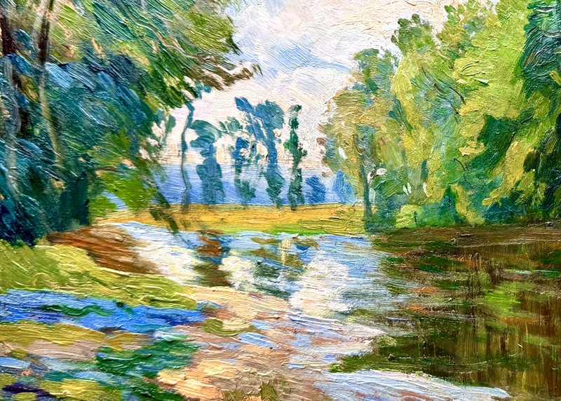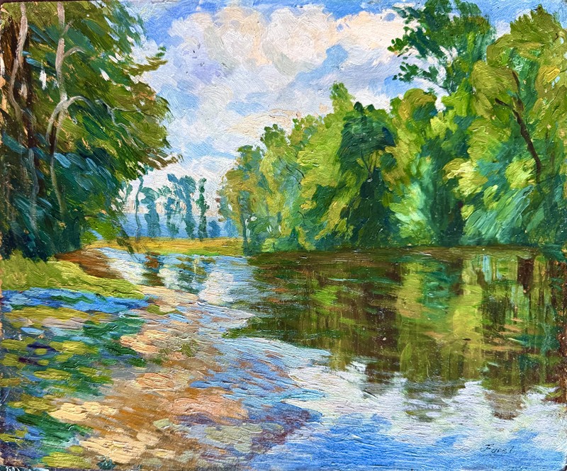 2 x krásný olej na kartonu, Krajina s řekou a Letní den o velikosti 30 x 35 cm, signováno vpravo dole, rámováno pod sklem tak, aby byl možný náhled obou stran obrazu. Jindřich Fürst (1873-1943) byl český krajinář generace konce 19.stol., žák Julia Mařáka na AVU v Praze. Člen Krasoumné Jednoty (KJ), Jednoty umělců výtvarných (JUV) a Umělecké besedy (UB).