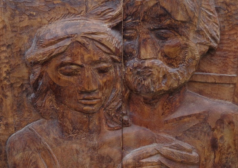 Rozměrný,závěsný,doudílný dřevořez,od ak.sochaře Jiřího Kleina (nar.14.10.1939 Slaný - 1989 Praha Strašnice),studia SPŠ sochařsko-kamenická v Hořicích a AVU Praha u prof.K.Hladíka,celkový rozměr 105x92 cm,na zadní straně původní,originální štítek s razítkem Českého fondu výtvarných umělců,jménem autora,názvem díla a původní cenou.