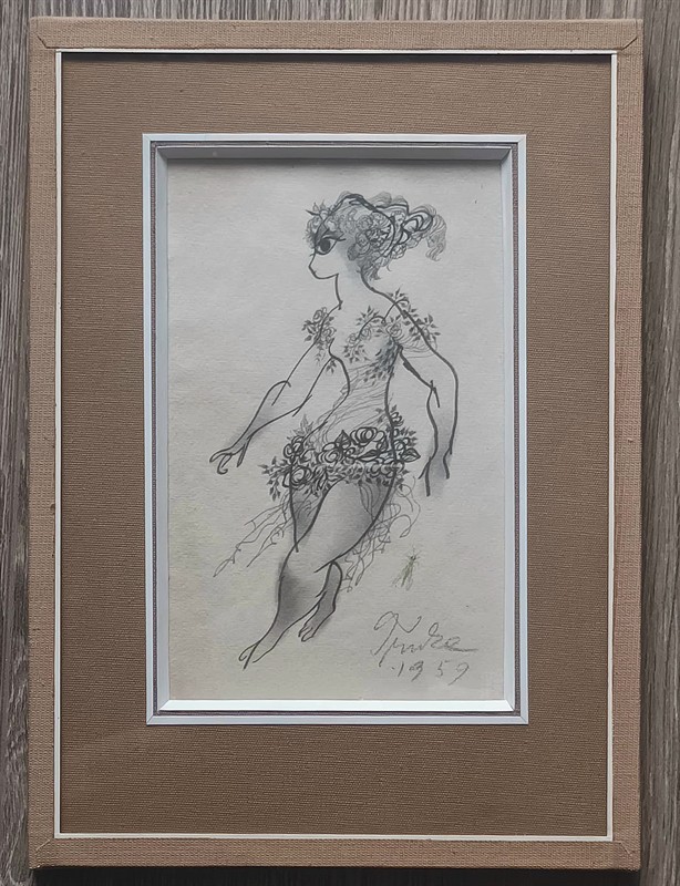 Rozměr 18 x 11,5 cm. Pasparta, sklo. Signováno a datováno 1959. Nepoškozeno.