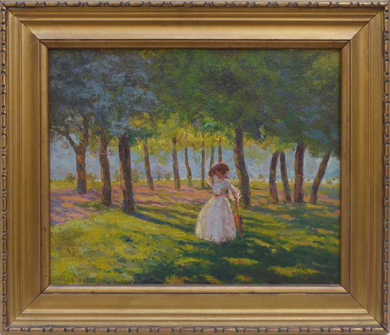 Olej na plátně fixovaném na kartonu 25,5 cm x 31,5 cm. Signováno vlevo dole s datací 1926. Autor obrazu: Josef Holub (1870-1957). Impresionistická nálada jednoho slunečného dne s dívkou v bílých šatech, v klobouku s širokou krempou a stuhou, držící v levé ruce slunečník při procházce parkem pod stínem stromoví. Ve zlaceném profilovaném rámu. Československo, rok 1926. Celkový rozměr s rámem 35 cm x 40 cm.