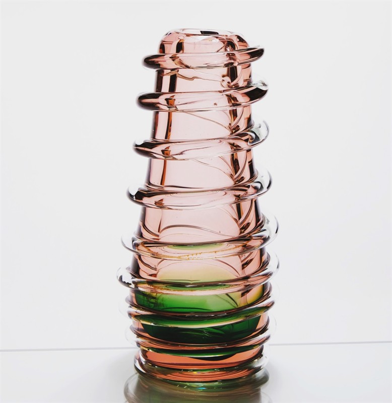 návrh 1958, provedení Borské sklo, sklárna Chřibská, model č. OK/149/1/24, výška 24,5 cm, růžové sklo se zeleným jádrem, opředené spirálou z čirého skla . Lit.: Glass Review. 1958, sv. 13, č. 11, s. 2-8, obr. na s. 8.