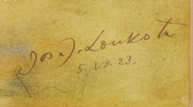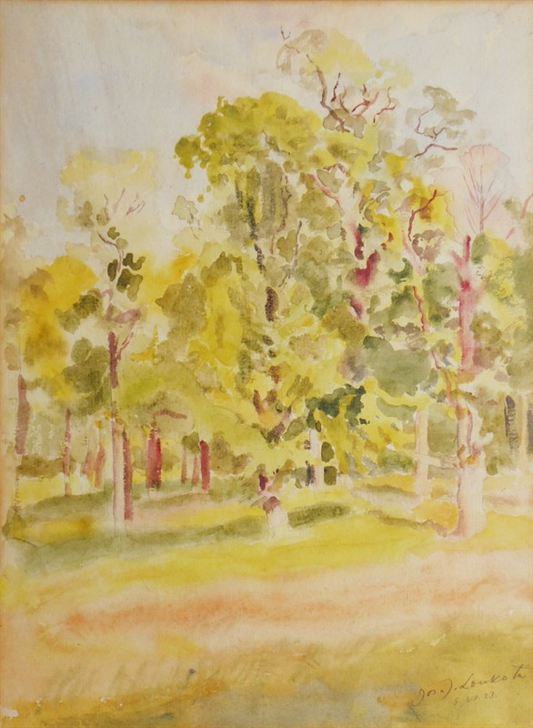 Akvarel na papíru 28 cm x 20 cm. Signováno vpravo dole s datací 5.VII.1923. Autor: Josef Jindřich Loukota (1889-1963). Pohled na lesopark za letního dne. Zlatý patinovaný rámeček s paspartou a sklem. Z umělcovy rodinné pozůstalosti. Československo, rok 1923. Celkový rozměr s rámem 38,5 cm x 30,5 cm.