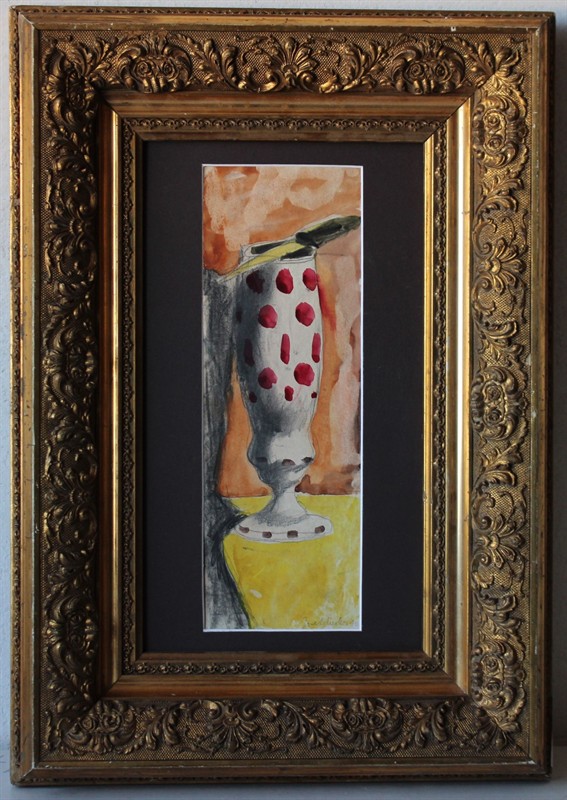 Josef Liesler (1912 - 2005) Zátiší s pohárem - 1940 Signováno viz foto. Malíř, grafik a profesor v Praze. Žák vysoké školy architektury a pozemního stavitelství v Praze (odb. prof. kreslení), kde byl žákem prof. O. Blažíčka, J. Sejpky a C. Boudy. Kvaš na silném papíru. Rozměry: 12 x 33 cm malba, 40 x 55 cm rám