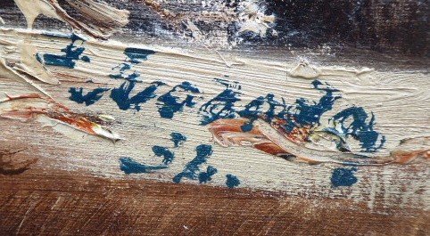 Olej na plátně 90 cm x 90 cm. Signováno vpravo dole s datací 1932. Autor obrazu: Josef Svoboda (1901-1945). Imprese barev s náladou podzimního dne s bystřinou protékající lesem. V originálním širokém klenutém rámu se stříbrnou patinou. Československo, rok 1932. Celkový rozměr s rámem 112 cm x 112 cm.