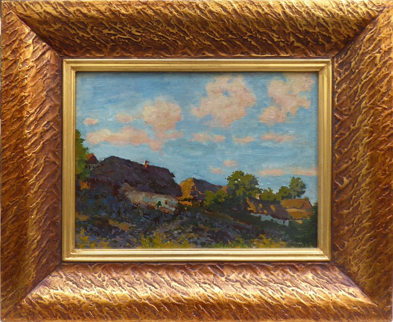 Olej na kartonu 25 cm x 34 cm. Signováno vpravo dole s datací 1921. Autor: Josef Tesař (1898-1953). Impresionistická olejomalba malých stavení rozložených ve stráni za polojasného letního dne. V širokém reliéfním zlatém rámu. Československo, rok 1921. Celkový rozměr 41 cm x 50 cm.