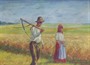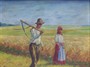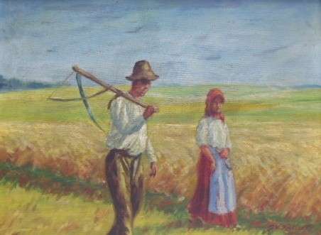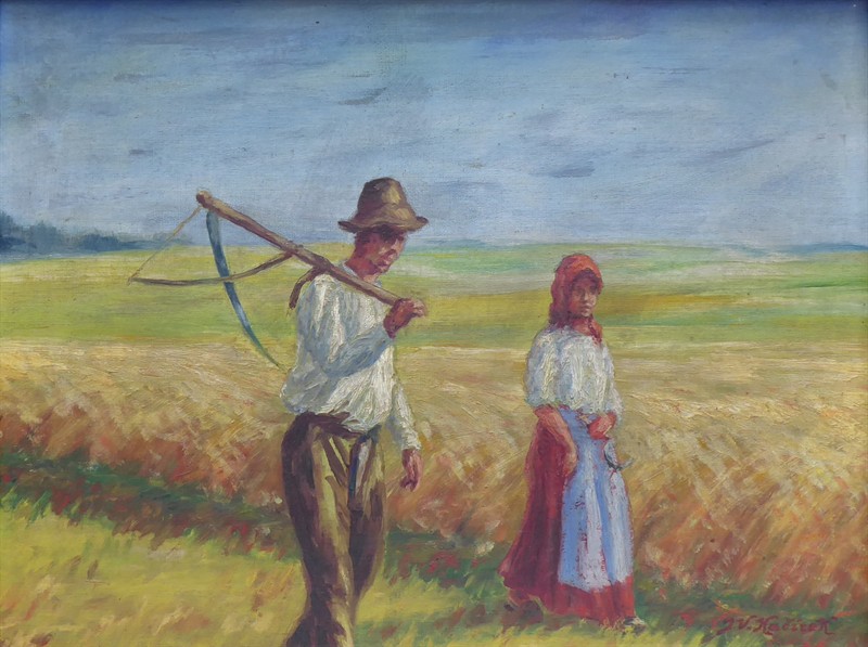 Olej na plátně fixovaném na kartonu 34 cm x 46 cm. Signováno vpravo dole. Autor: Josef Vladimír Kačírek (nar. 1899). Dvojice představující žence s kosou přes rameno (muž, který seká, kosí obilí) a ženy, jež pomáhala vázat obilí do snopů. V tmavě mořeném dřevěném rámu s vnitřní vyřezávanou lištou s měděnou patinou. Československo 1925 - 1940. Celkový rozměr s rámem 46 cm x 57 cm.
