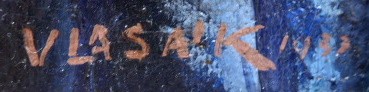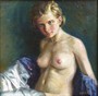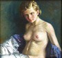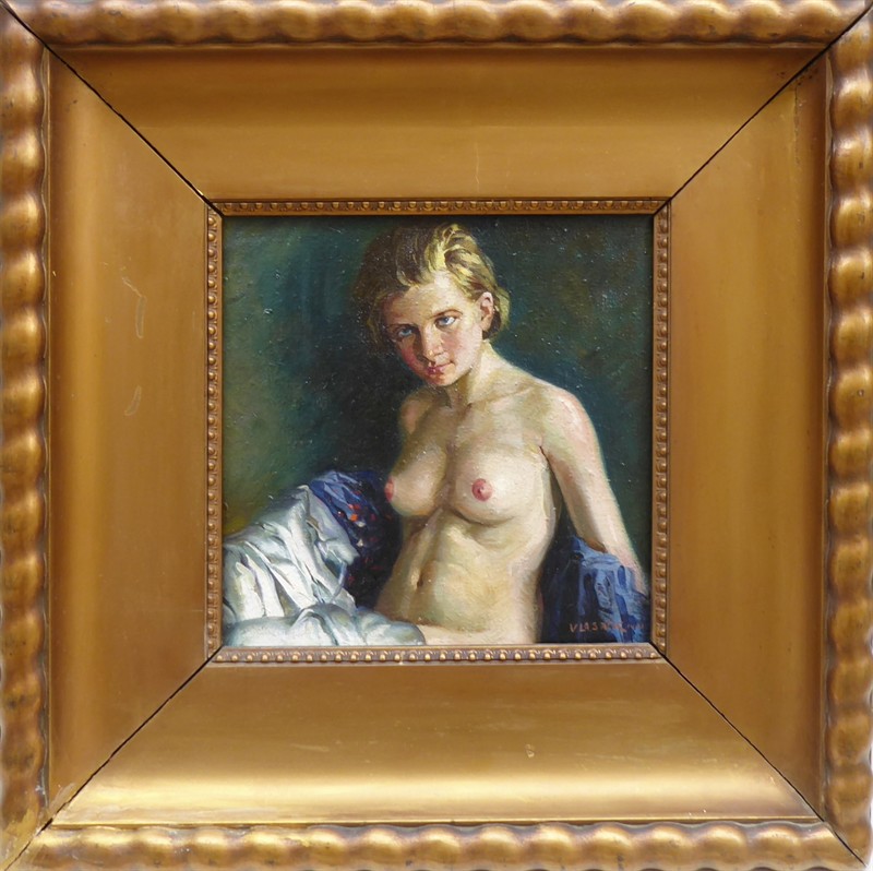Olej na plátně 28 cm x 28 cm. Období a styl: art deco. Signováno vpravo dole s datací 1933. Autor: Josef Vlasák mladší, syn Josefa Vlasáka (1851-1907) a pokračovatel rodinné živnosti v oboru uměleckého sklářství, jenž spolupracoval i na výzdobě Obecního domu v Praze. Akt polonahé dospívající dívky, jejíž klín je zahalen do bohatě řasených pokrývek. V širokém luxusním zlaceném rámu s reliéfními ornamenty provazce. Československo, rok 1933. Celkový rozměr s rámem 50 cm x 50 cm.