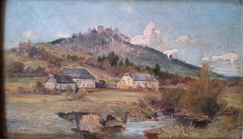 Olej na dřevěné desce 20x30 cm. Původní stav. Hrad Klenová u Klatov.Signováno vlevo dole K.Liebscher.