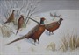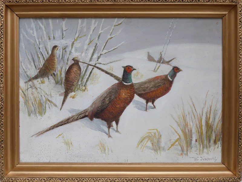 Olej na kartonu 50 cm x 69 cm. Signováno vpravo dole. Autor obrazu: Karel Walter Jizerský (nar. 1892). Zimní scenérie párů bažantů a koroptví na sněhové pláni. Originální zlatý rám s reliéfní zdobnou horní lištou. Na malbě místy tečky od hmyzu. Československo 1920 - 1940. Celkový rozměr s rámem 59 cm x 78,5 cm.