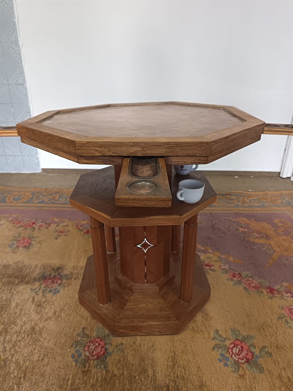 velmi praktický karetní stůl p.desry 80cm v.78cm dubová dýha ,měd ,perleř