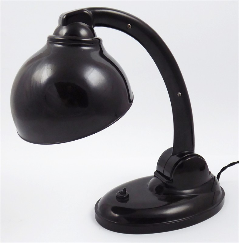 Hnědý bakelit FUTURIT. Původní předválečný typ stolní lampy od slovenské firmy Továrňa na kábele, účastinná společnost - závod Gummon, číslo 220 s názvem FUTURIT z vylepšené bakelitové směsi. Po roce 1950 se výroba přesunula do podniku Elektrosvit, Nové Zámky, a to pod označením typ 11126. Otočné kulaté stínidlo. Obloukovitě tvarované polohovací tělo lampy na spodním kloubu. Oválná základna s vypínačem. Nově elektrifikována, funkční. Československo, 40. až 50. léta minulého století. Výška 35,5 cm, průměr širmu 16 cm, základna 22 cm x 14 cm.