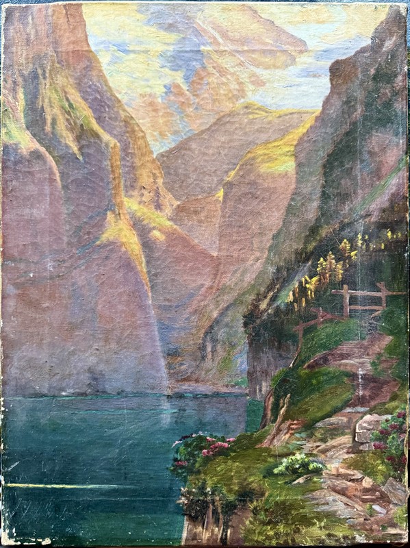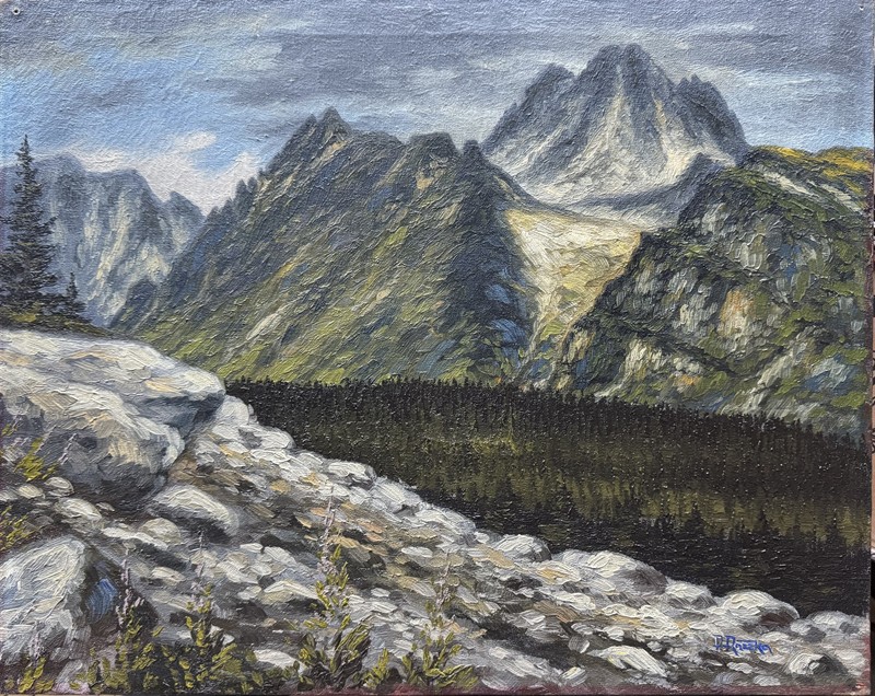 4 olejomalby z období 1880-1940: 1. Pavel Raszka: motiv z Vysokých Tater, olej na plátně o velikosti 40x50 cm, signováno vpravo dole 2. V. Podzimek: Náměstí v Českých Budějovicích (1913), olej na plátně fix.na kart. velikost 36x25 cm 3. Alpská krajina s jezerem z konce 19.století, olej na plátně na blindrámu, nesignováno, velikost 40x30 cm 4. Neurčený malíř přelomu 19.a 20.století: “Skály v horách”, sign.vpravo dole, plátno fixované na kartonu, velikost 30 x 40 cm