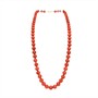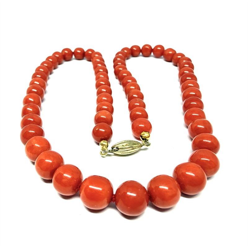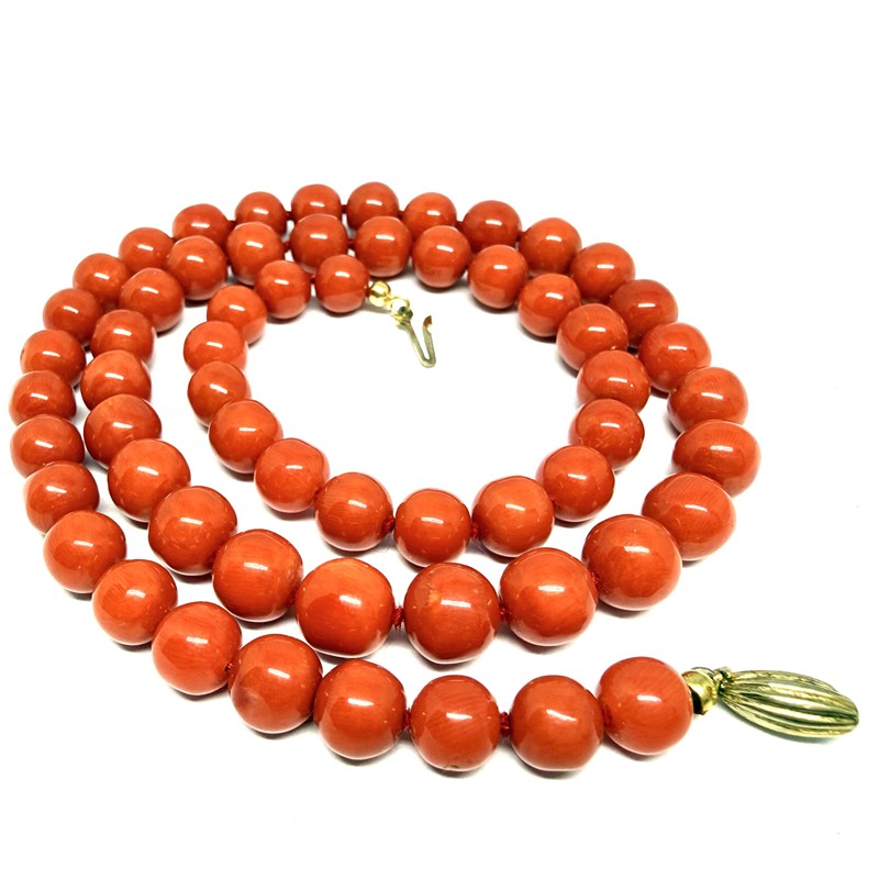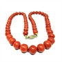 Výrazný náhrdelník z velkých, mimořádně kvalitních červených korálů. Korály mají výrazný červenooranžový odstín a každý z nich je precizně prouzlíkovaný. Průměr cca 7 mm. Elegantní zapínání ze zlaceného stříbra ryzosti 835/1000. Délka cca 50 cm. Perfektní stav.