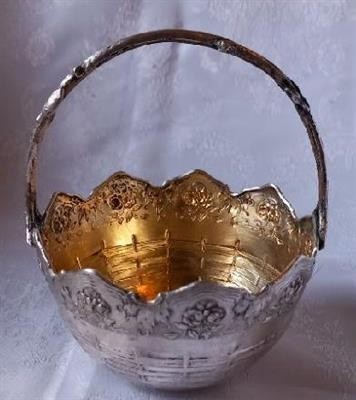 Kulatý košíček s rukojetí je stříbrný, uvnitř zlacený. Je puncovaný platným puncem pro stříbro 800/1000 a váží 112,00 gramů. Košíček je vysoký včetně rukojeti 13 cm a průměr v nejširší části je 10 cm. Okraj košíčku je zoubkovitě vykrojený a je zdobený vytlačovaným květinovým motivem. Rukojeť košíčku se vine jako stvol rostliny s plastickými lístečky na obou stranách. Celý košíček je velmi dekorativní. Lze použít jako cukřenka nebo k dekoraci suchých květin. je to krásný dárek ke svatbě, ke křtinám, k promoci nebo pod stromeček.