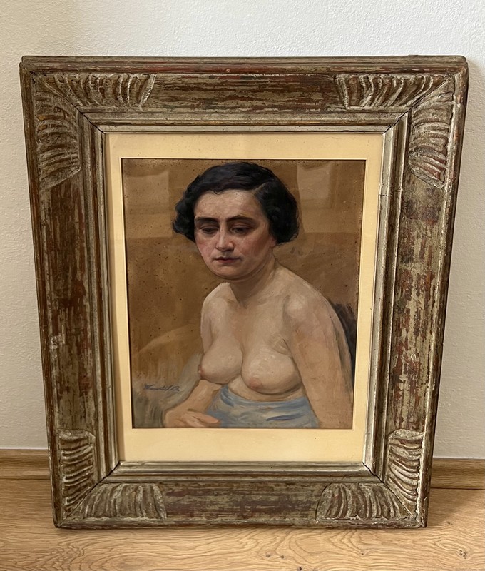 J. Koudelka (*1877) - Akt, olej / karton, rozměr 40 x 33 cm (68 x 55), rámováno v ručně řezaném rámu, signováno. Výborný figurální malíř, žák prof. Obrovského.