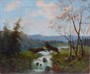 Olej na plátně. Nesignováno. Ve stylu romantických krajin druhé poloviny 19. století. Dvojice jelenů překonávající skokem horskou bystřinu. Nerámováno. Střední Evropa 1870 - 1890. Rozměr: 39 cm x 47 cm.