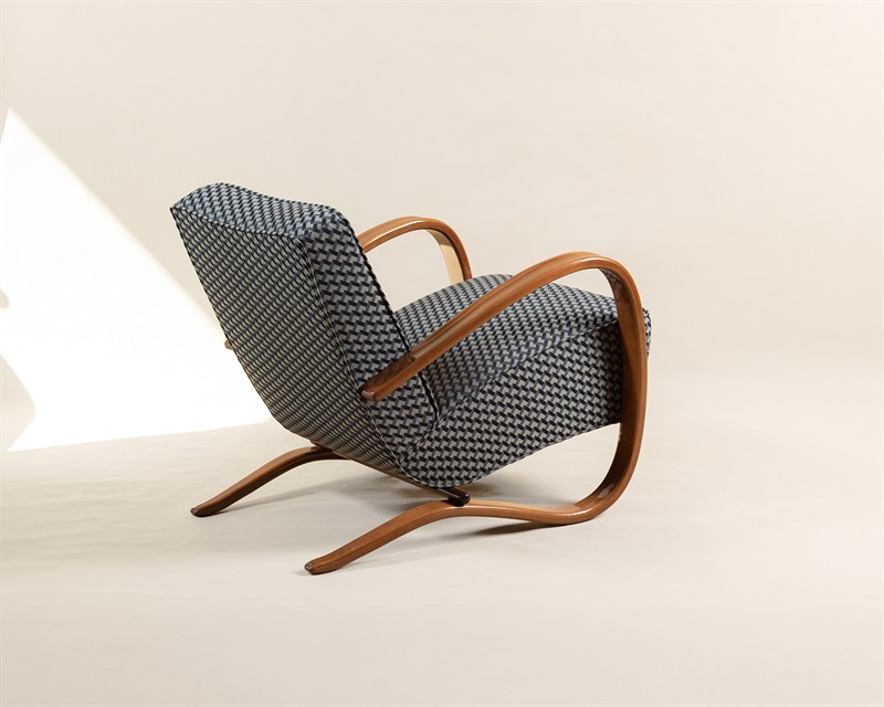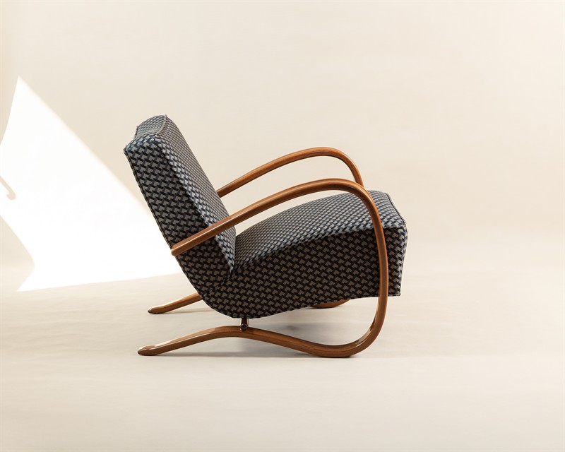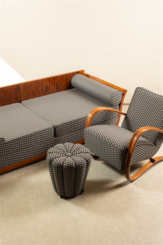 KŘESLO H-269-J. HALABALA Datování-30. léta 20. století Původ-Čechy Design-J.Halabala Materiál-dřevěný korpus, bukové područky, nové čalounění Rozměry-v74 š70 h90 Cena křeslo 66000 kč kus. Cena taburet 12000 kč Doprava-zajištění po dohodě