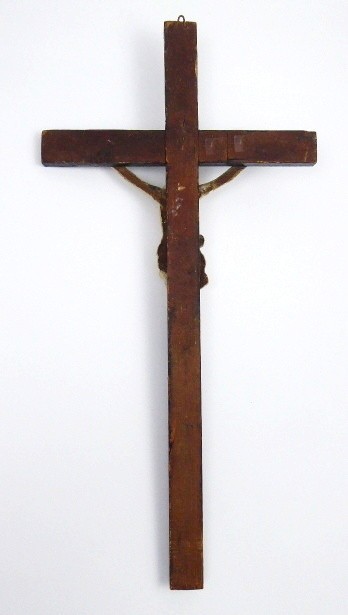 Dřevořezba, polychromie, patinováno. Přiloženo osvědčení Národního památkového ústavu České republiky. Vysoký krucifix se z běžného pojetí vymyká umístěním titulu s písmeny IN/PJ. Hlava Ježíše s velmi drobným tělem je skloněná k pravému rameni a rána umístěna vlevo na hrudi je vyznačena červeně. Bederní rouška (perizonium) krémové barevnosti je uvázána na pravém boku. Dřevěný kříž černé barvy je lakovaný. Nahoře na zadní straně kříže oko na závěs. Střední Evropa 1900 - 1940. Výška 65 cm.