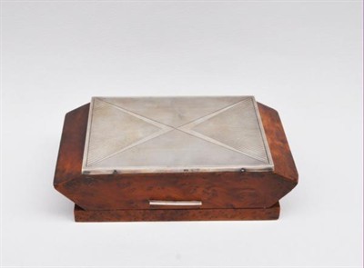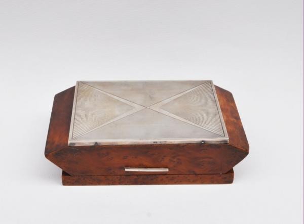 kubistická dřevěná kazeta na čtyřicet cigaret, ořechová dýha, víko ozdobené gilošovaným a gravírovaným stříbrným krytem, Ag btto 741,75 g/800/000, kolem roku 1920, střední Evropa; výška 5,7 cm, výška otevřené kazety 12,5 cm, délka 19,7 cm, šířka 11 cm; atest Puncovního úřadu; dobrý původní nerestaurovaný stav