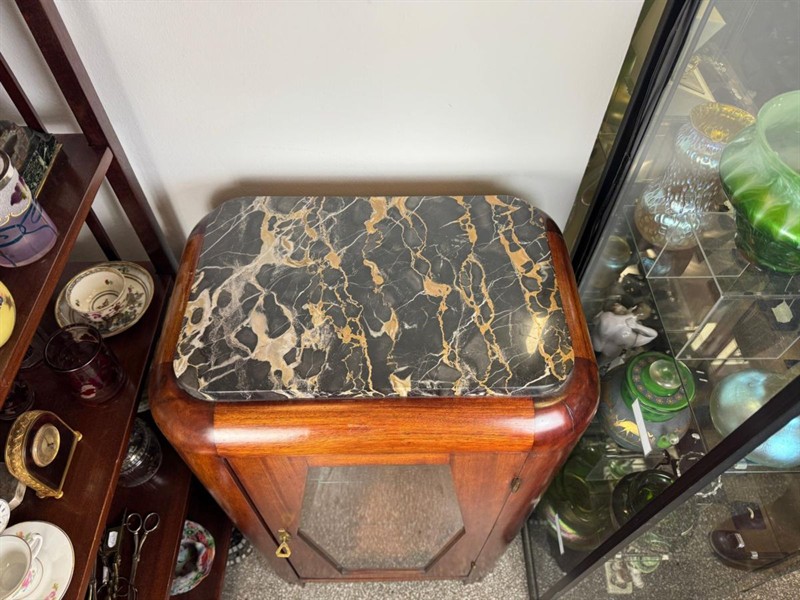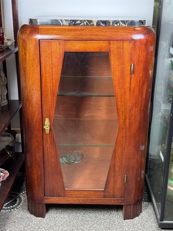 kubistická skříňka z masivního ořechového dřeva s mramorovou deskou a prosklenými dvířky, výrazné detaily, Československo (Čechy), kolem r. 1925, nerestaurovaná, v dobrém bytovém stavu, rozměry 85 x 54 x 38 cm
