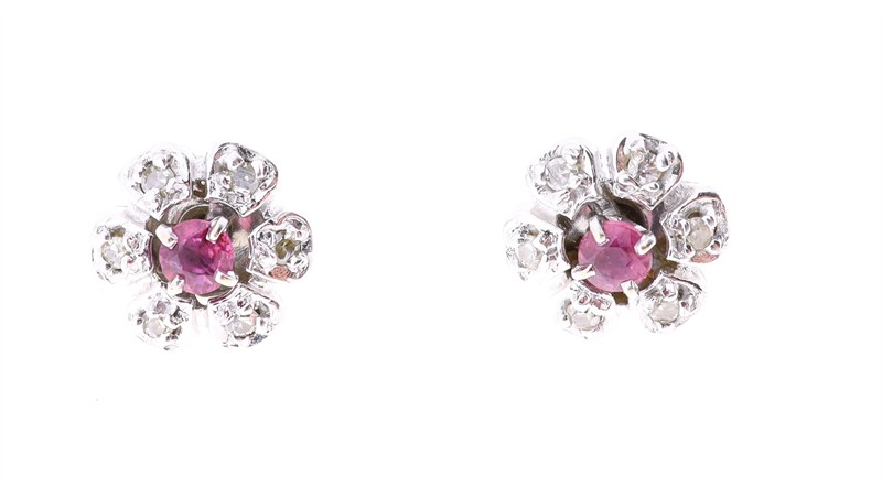 č. 180 207 Květinové náušnice s rubíny a diamanty ze 14kt bílého zlata