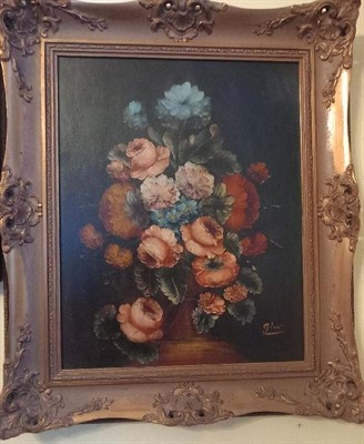 Květinové zátiší je olejomalba na plátně zasazená v krásném širokém zlaceném rámu. Obraz měří včetně rámu 66 x 56 cm, měřeno bez rámu je rozměr plátna 51 x 40 cm. Podpis malíře je vpravo dole.