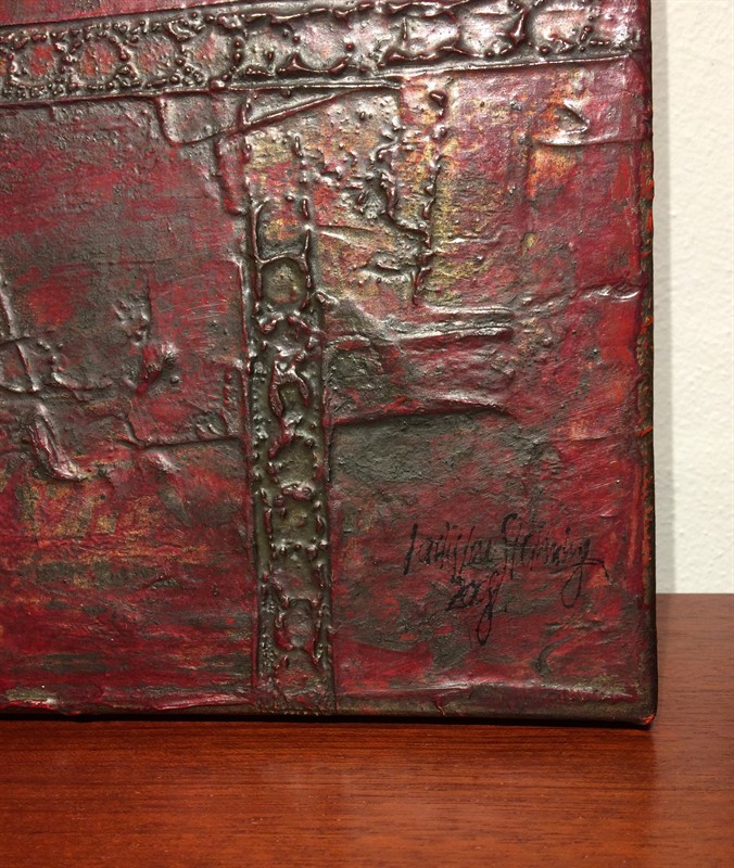 Jeden z nejvýznamnějších obrazů autora, opakovaně vystavovaný a reprodukovaný v souhrnném katalogu díla. Olej na plátně se strukturálními prvky, 65x65 cm, s ručně na míru v Itálii vyrobeným rámem 80x80 cm. Signováno a datováno vpravo dole, signatura a popis i vzadu na napínacím rámu. Zajímavá textura povrchu, použití i zlatého prachu a pod. Autor měl desítky autorských výstav u nás i v zahraničí, uznávaná je jeho grafika, je i sochařem, autorem ceněných reliéfů. Autorské výstavy měl ve Slezsku, na Moravě, Polsku, Francii … Pro jeho kresby si jezdí galeristka z Paříže. V Čechách nevystavuje. Přestože na výstavách a přímo v ateliéru prodal téměř 200 olejomaleb, na sekundárním trhu se nic nevyskytuje, majitelé si je ponechávají. Na sekundárním trhu tedy nemůže být známý.